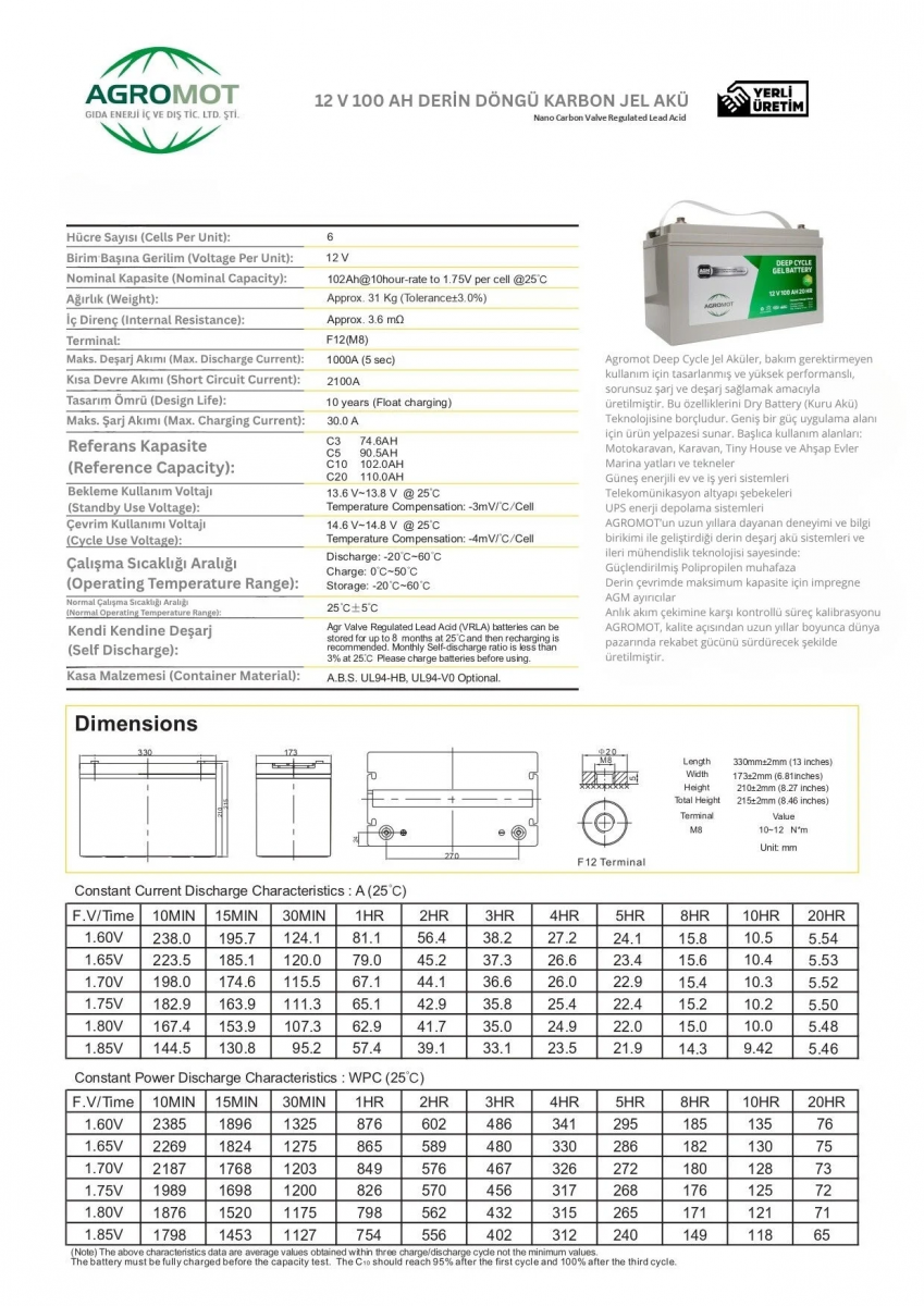 Agromot 100Ah Jel Akü, düşük bakım maliyeti ve dayanıklılığıyla özellikle karavan, deniz araçları ve off-grid güneş sistemleri kullanıcıları için ideal tercihtir. Nano karbon teknolojisi sayesinde enerji verimliliğinizi artırın, uzun vadeli kesintisiz güç avantajını yaşayın.