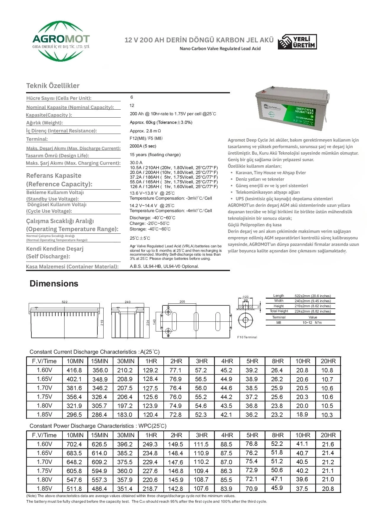 Agromot 12V 200Ah Jel Akü – Deep Cycle Nano Carbon AGM Teknolojisi