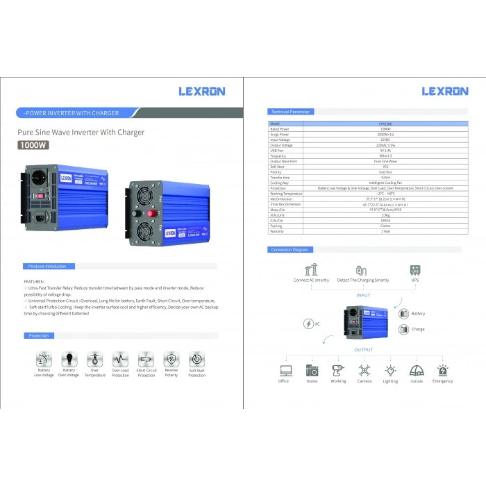 Lexron 12V 1000W Tam Sinüs İnverter; 12V akü sistemlerinde AC ihtiyaçlarını karşılamak için tasarlanmış, stabil ve yüksek kaliteli güç çıkışı sunan bir inverterdir. Tam sinüs dalga yapısı sayesinde tüm hassas elektronik cihazlarla tam uyumludur ve uzun ömürlü kullanım sağlar.