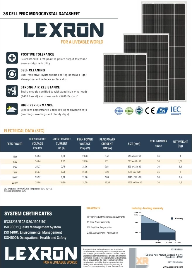 Standart Test Koşulları: Am=1.5 E=1000W/m2 Tc=25℃