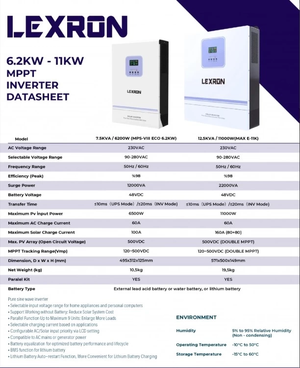 Lexron 6.2kW 48V Akıllı İnverter; off-grid ve hibrit güneş enerjisi sistemlerinde yüksek performans, stabil güç çıkışı ve uzun ömür sunmak için tasarlanmış profesyonel bir enerji yönetim cihazıdır. 48V lityum ve jel akülerle tam uyumlu çalışır, gelişmiş MPPT teknolojisi sayesinde güneş panellerinden maksimum verim elde eder.
