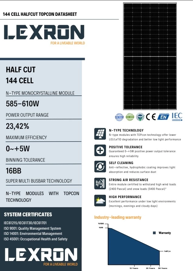 Lexron 610W 144HC Monofacial Half-Cut Topcon Güneş Paneli (10 ADET)