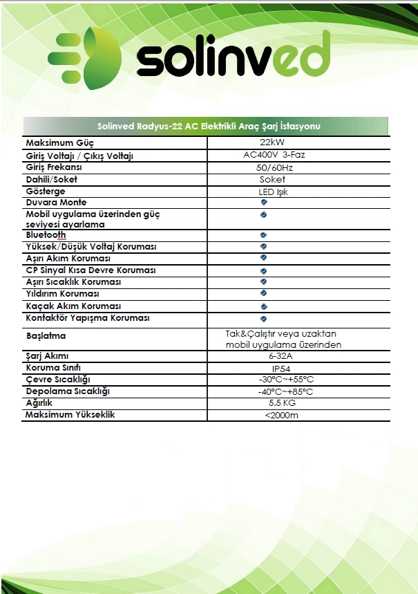 Solinved Radyus AC Elektrikli Araç Şarj İstasyonu Özellikleri