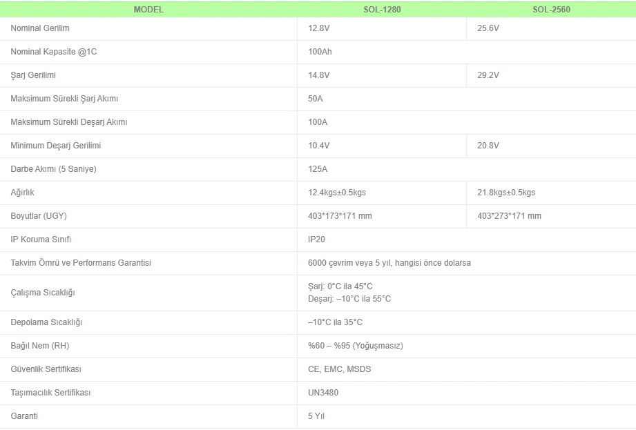 Teknik Özellikler – Solinved Smart LiFePO4 Akü Serisi