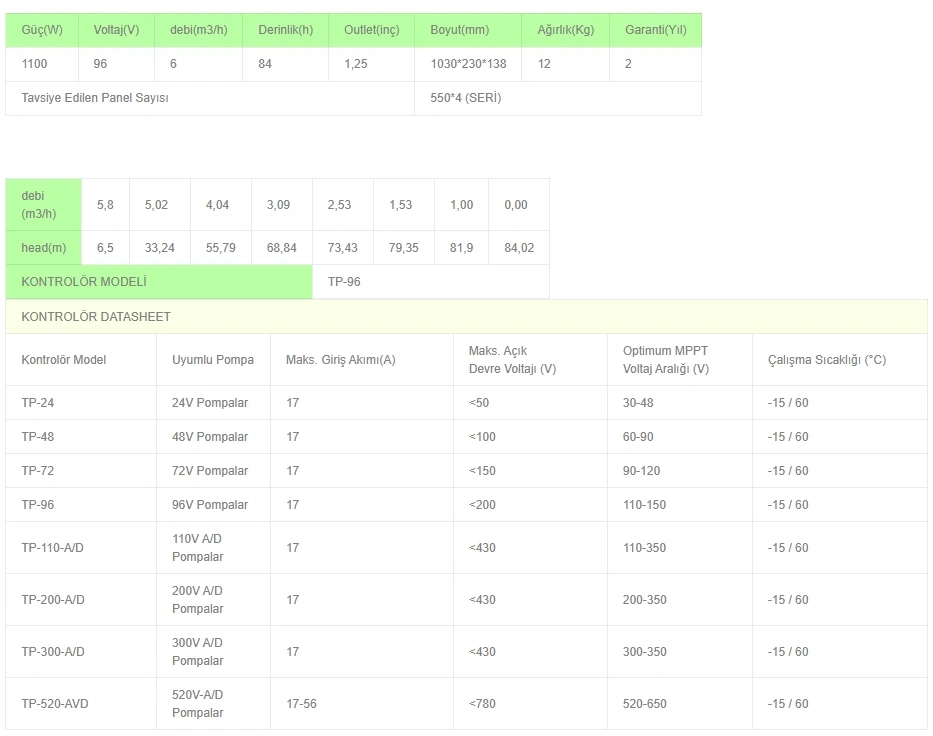 Solinved 3” 96V 1100W Solar Dalgıç Pompa – 6 Ton/Saat Kapasite, 96 Metre Maksimum Basma Yüksekliği