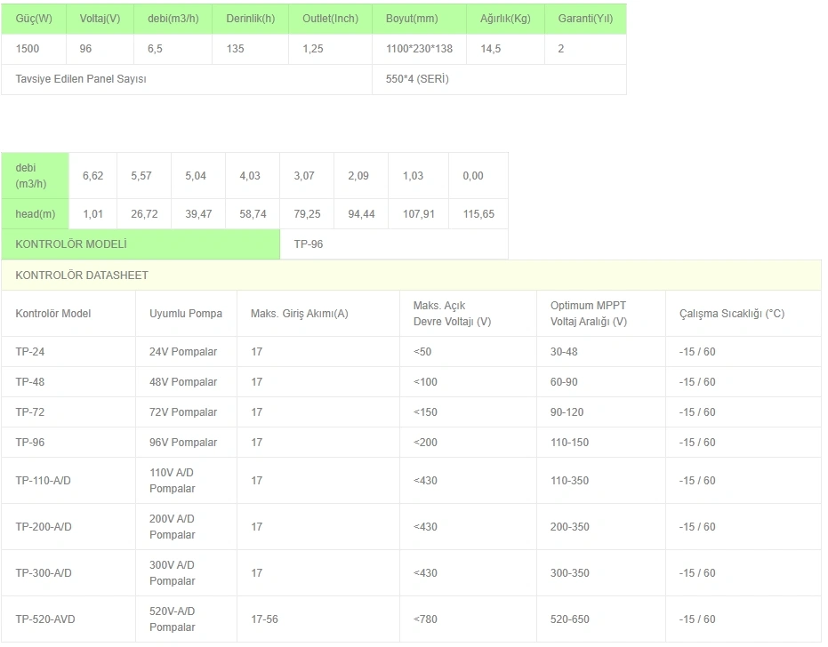 Solinved 4inç 96V 1500W 16ton HMAX:70mt outlet: 2 dc pompa