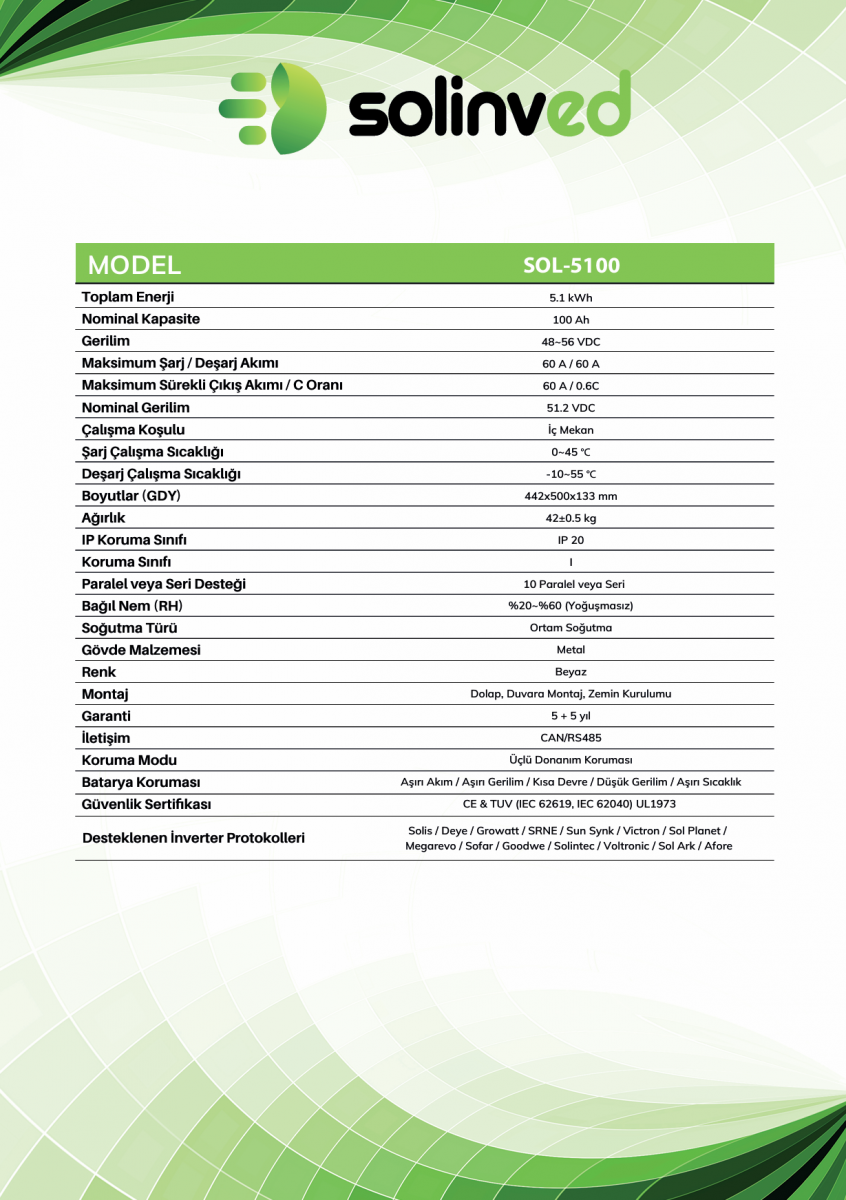 Solinved 51,2 V 100Ah Lityum Raf Akü Serilenebilir – SOL-5100-HV