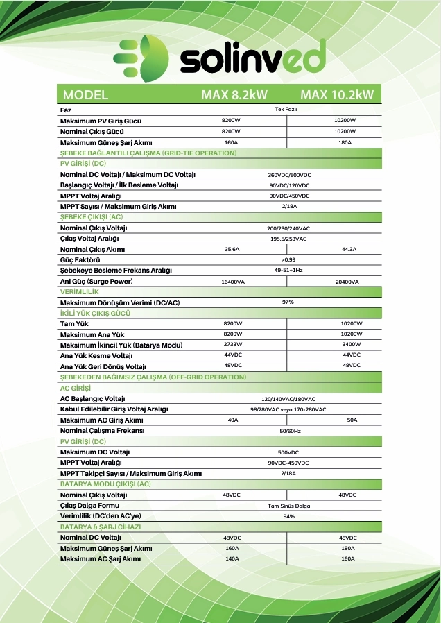 Solinved 8.2 kW Max Serisi MPPT Off-Grid İnverter – Teknik & Kullanım Açıklaması