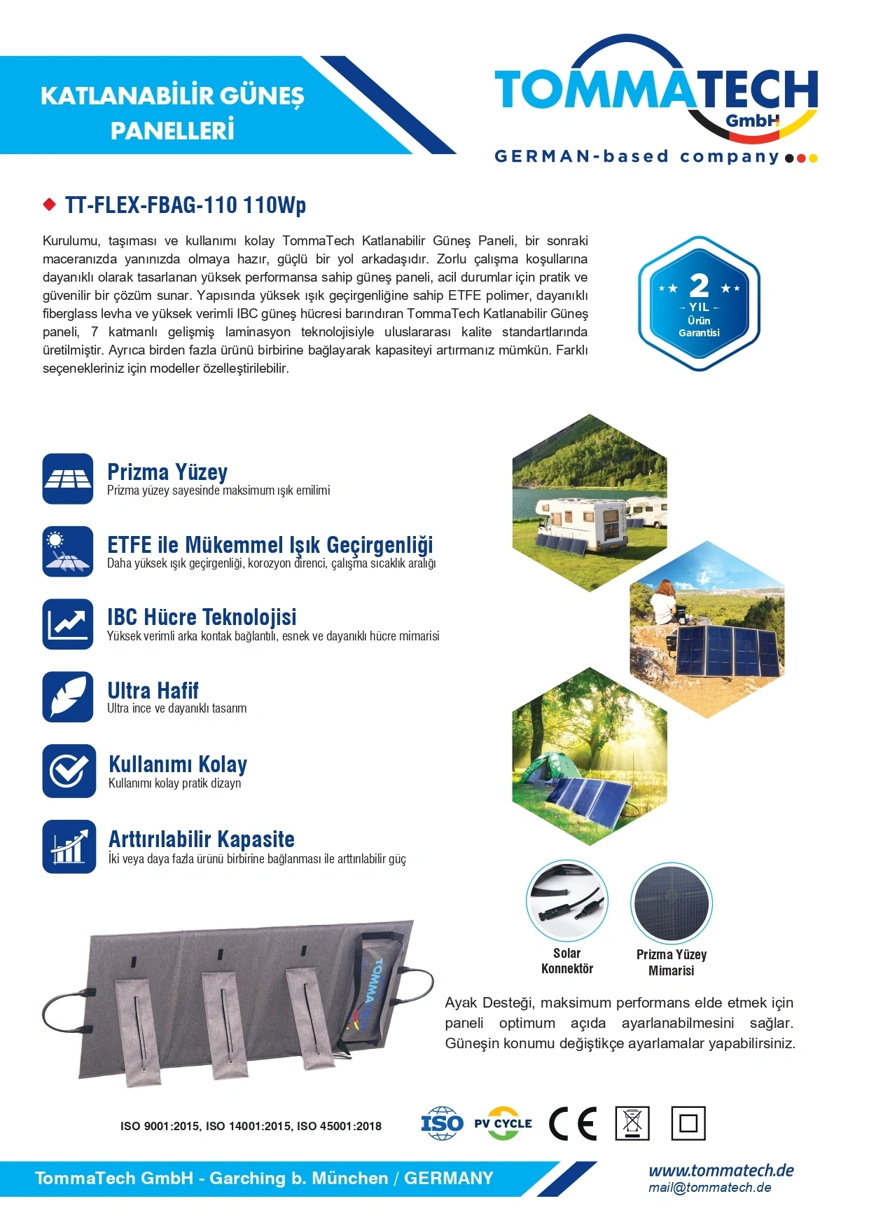 TommaTech 110W Katlanabilir Güneş Paneli, doğa aktiviteleri, karavan kullanımı, acil enerji ihtiyaçları ve taşınabilir solar çözümler için geliştirilmiş kompakt bir enerji kaynağıdır.