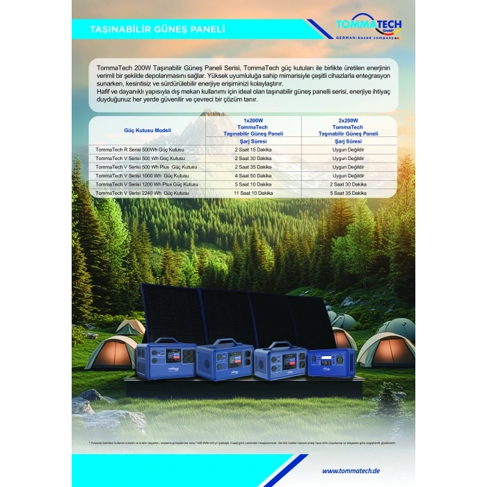 TommaTech 200W katlanabilir panel, birçok taşınabilir güç istasyonu ve solar şarj cihazı ile uyumludur. MC4 bağlantıları sayesinde invertör, şarj kontrol cihazı veya power station ile sorunsuz çalışır.