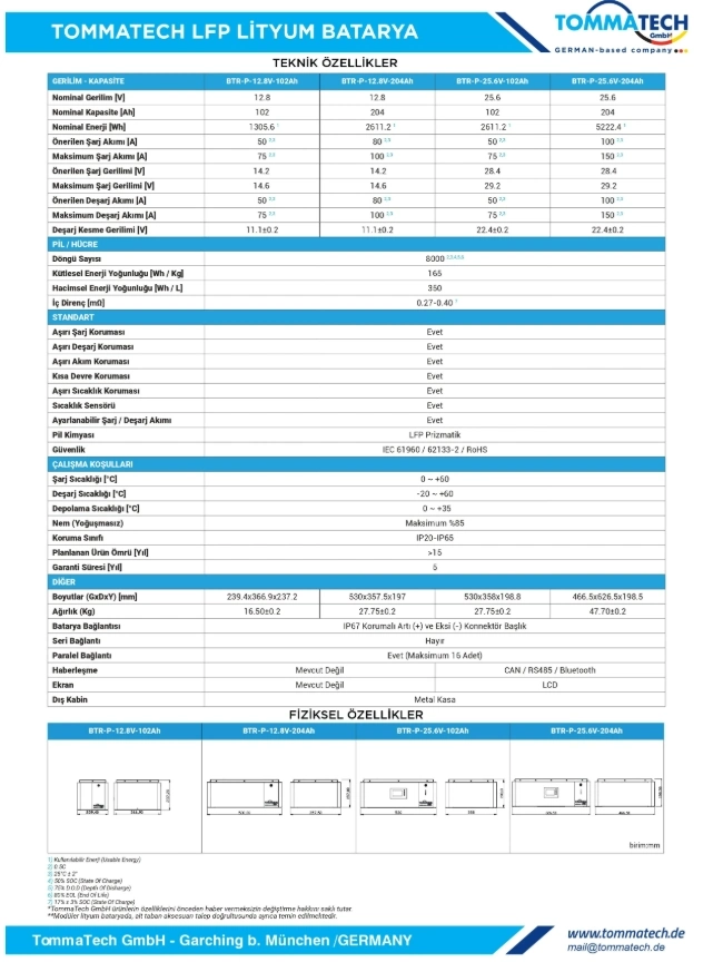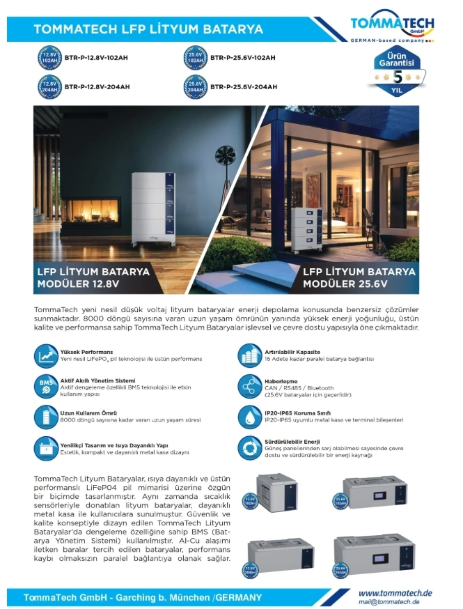 TommaTech 25.6V 204Ah LiFePO4 Batarya, modern güneş enerji sistemleri, karavan çözümleri, off-grid evler ve endüstriyel uygulamalar için tasarlanmış yüksek performanslı bir enerji depolama teknolojisidir. LFP kimyası sayesinde 6000+ döngü kullanım ömrü, yüksek güvenlik ve düşük enerji kaybı sunar.