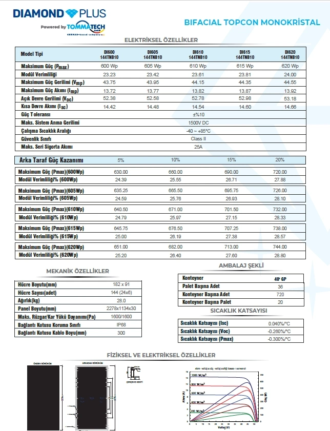 TOMMATECH DİAMOND PLUS 620W 144 HÜCRE BİFACİAL TOPCON GÜNEŞ PANELİ