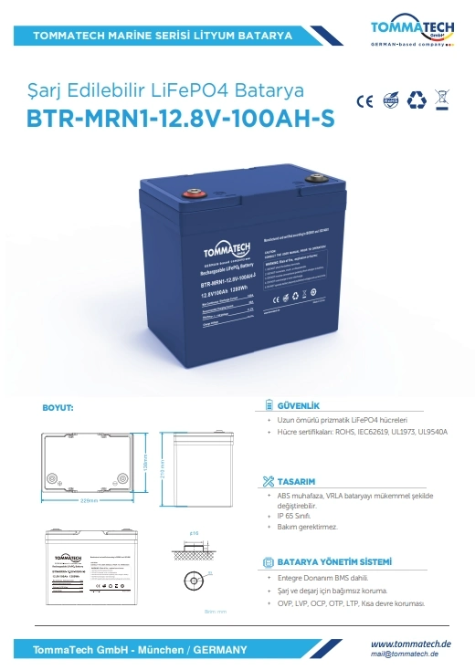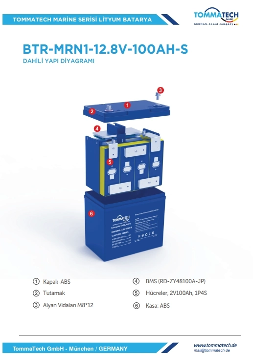 Tommatech Marine ABS Kasa Batarya 12.8V 100Ah LFP Lityum Batarya