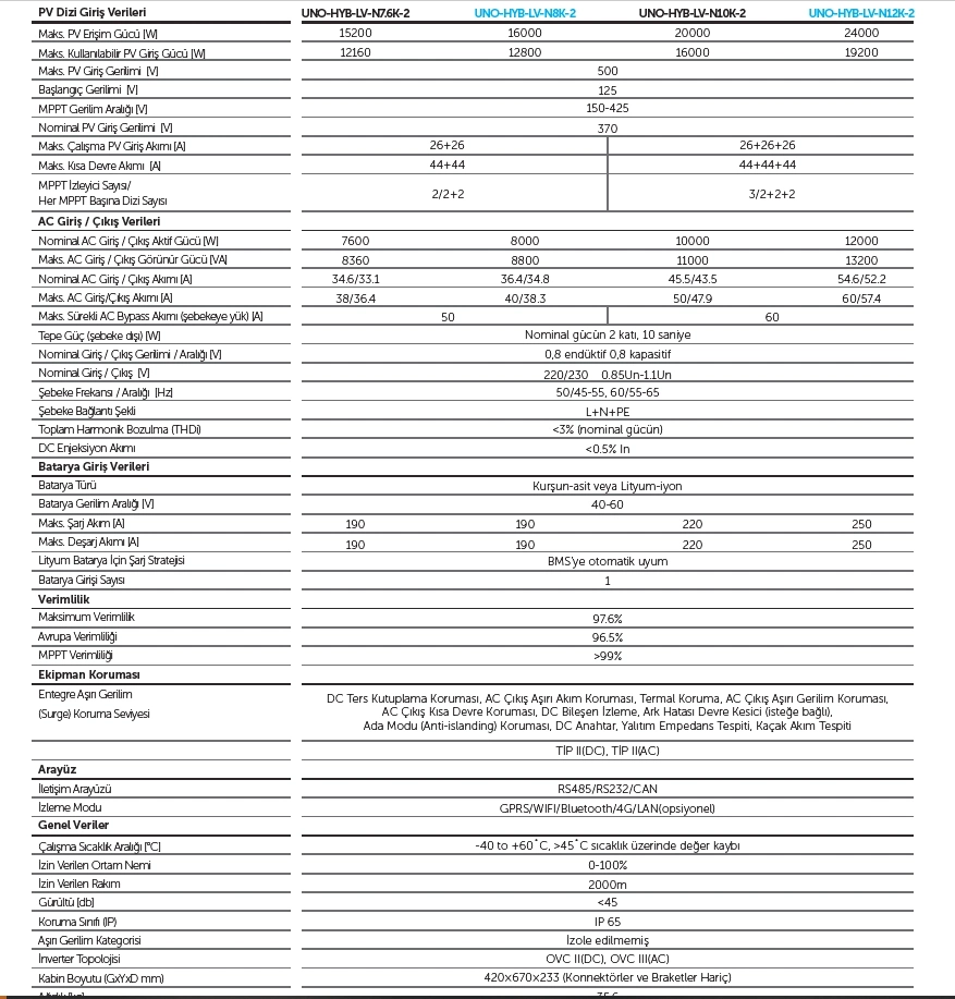 %97,6 maksimum verim ve %96,5 Avrupa verimliliği ile çalışan inverter, gelişmiş MPPT algoritması sayesinde güneş enerjisinden en yüksek faydayı sağlar. DC ve AC tarafında kısa devre, aşırı akım, aşırı sıcaklık, ters kutup ve ada modu korumaları ile sistem güvenliğini üst düzeyde tutar.
