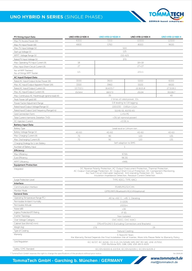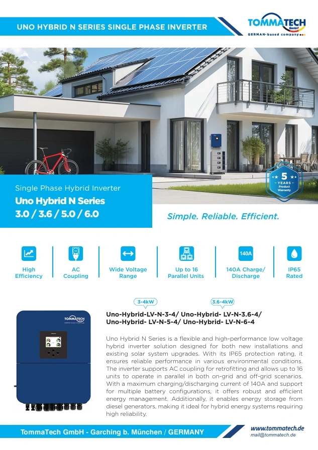 TommaTech Uno N 6 kW LV Hibrit İnverter, güneş paneli + batarya + inverter + MPPT şarj kontrol ünitesini tek kasada birleştiren, kompakt ama güçlü bir hibrit güç sistemidir. Özellikle 48 V batarya bankalarıyla uyumlu, esnek ve genişletilebilir enerji çözümleri arayanlar için tasarlanmıştır.