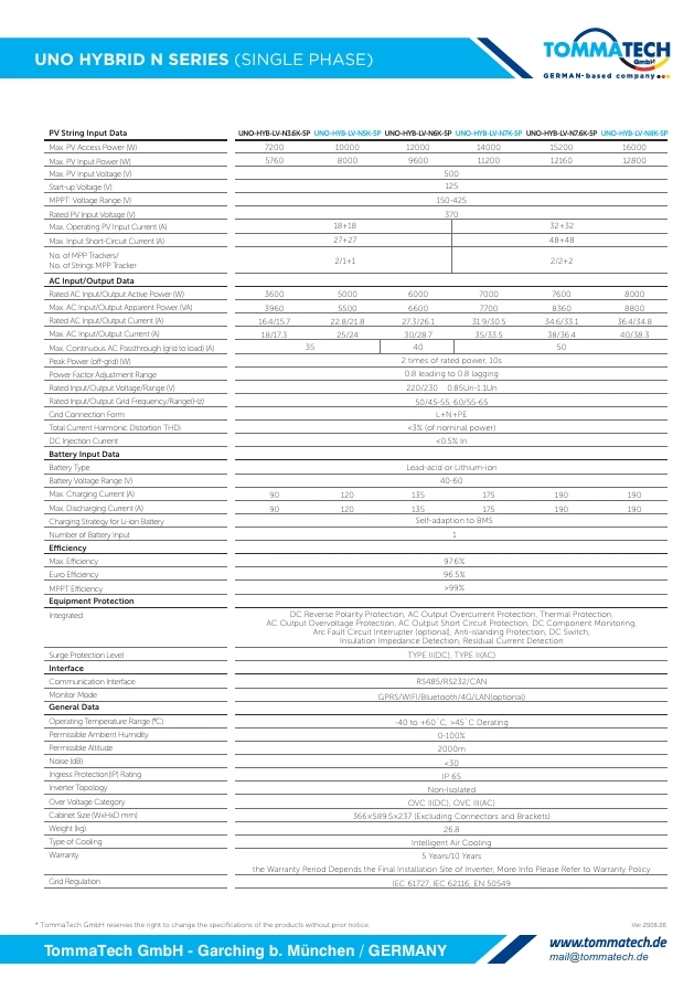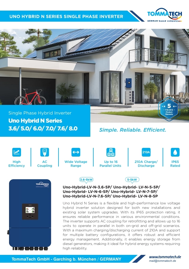 TommaTech Uno N Serisi 8 kW LV Hibrit İnverter – Güçlü, Esnek ve Güvenilir Hibrit Çözüm